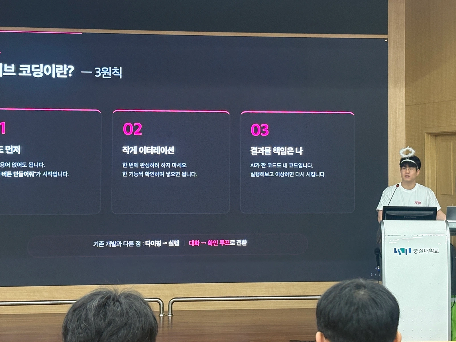 40분 분량으로 바이브 코딩 비기너를 위한 세션을 진행했다. 바이브 코딩의 3원칙(의도 먼저, 작게 이터레이션, 결과물 책임은 나)을 소개하고 프롬프트 작성법을 다룬 뒤, 두 트랙으로 나누어 시연했다.